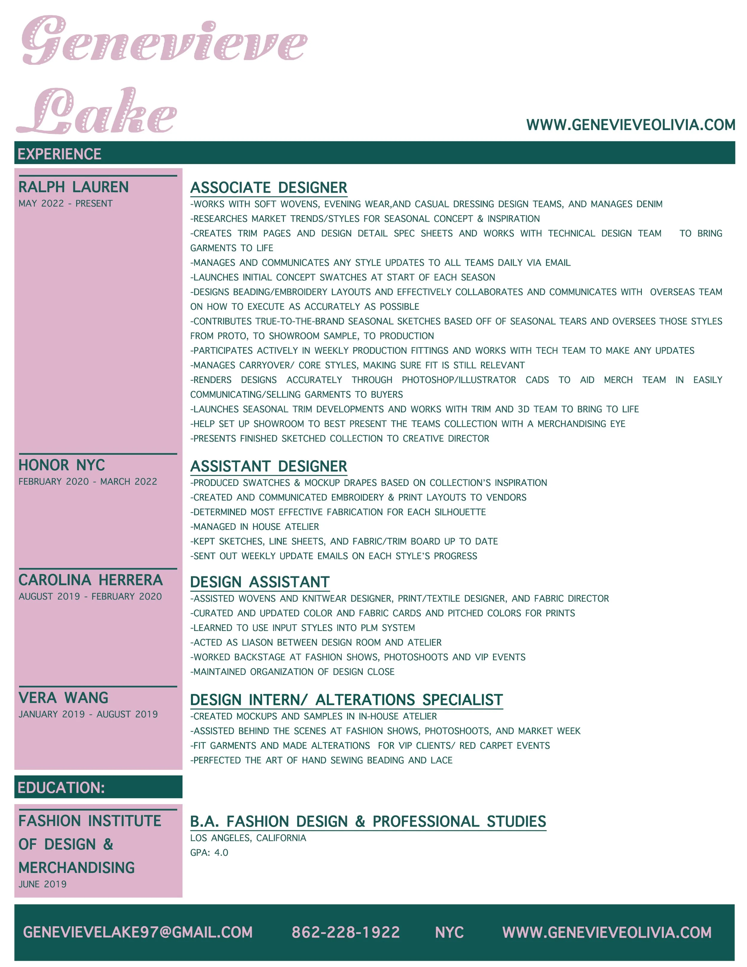 ResumePORTFOLIO PROFESSIONAL WORK RALPH LAUREN CAROLINA HERRERA VERA WANG HONOR NYC SUPIMA FIDM DEBUT Contact